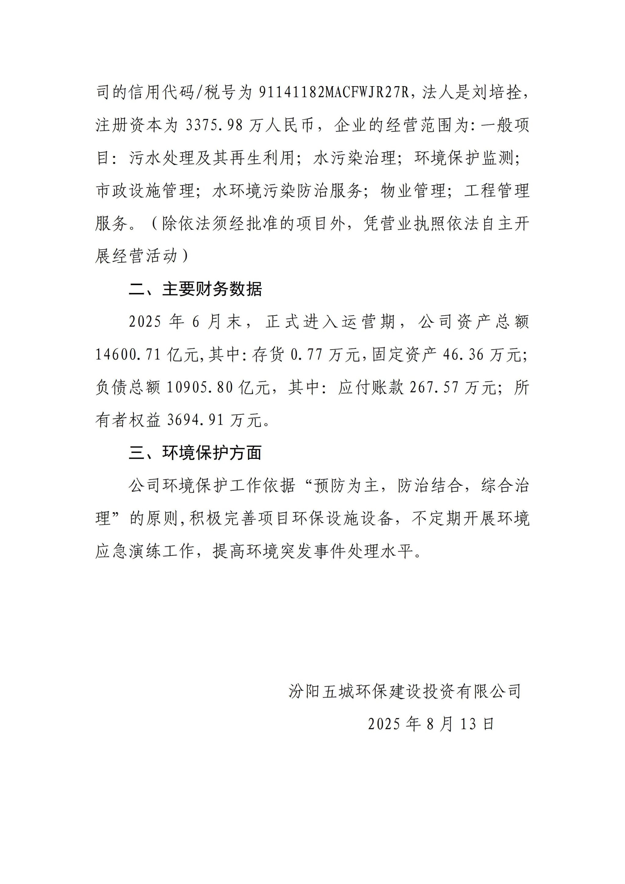 汾阳五城环保建设投资有限公司2025年二季度企业重大信息公开