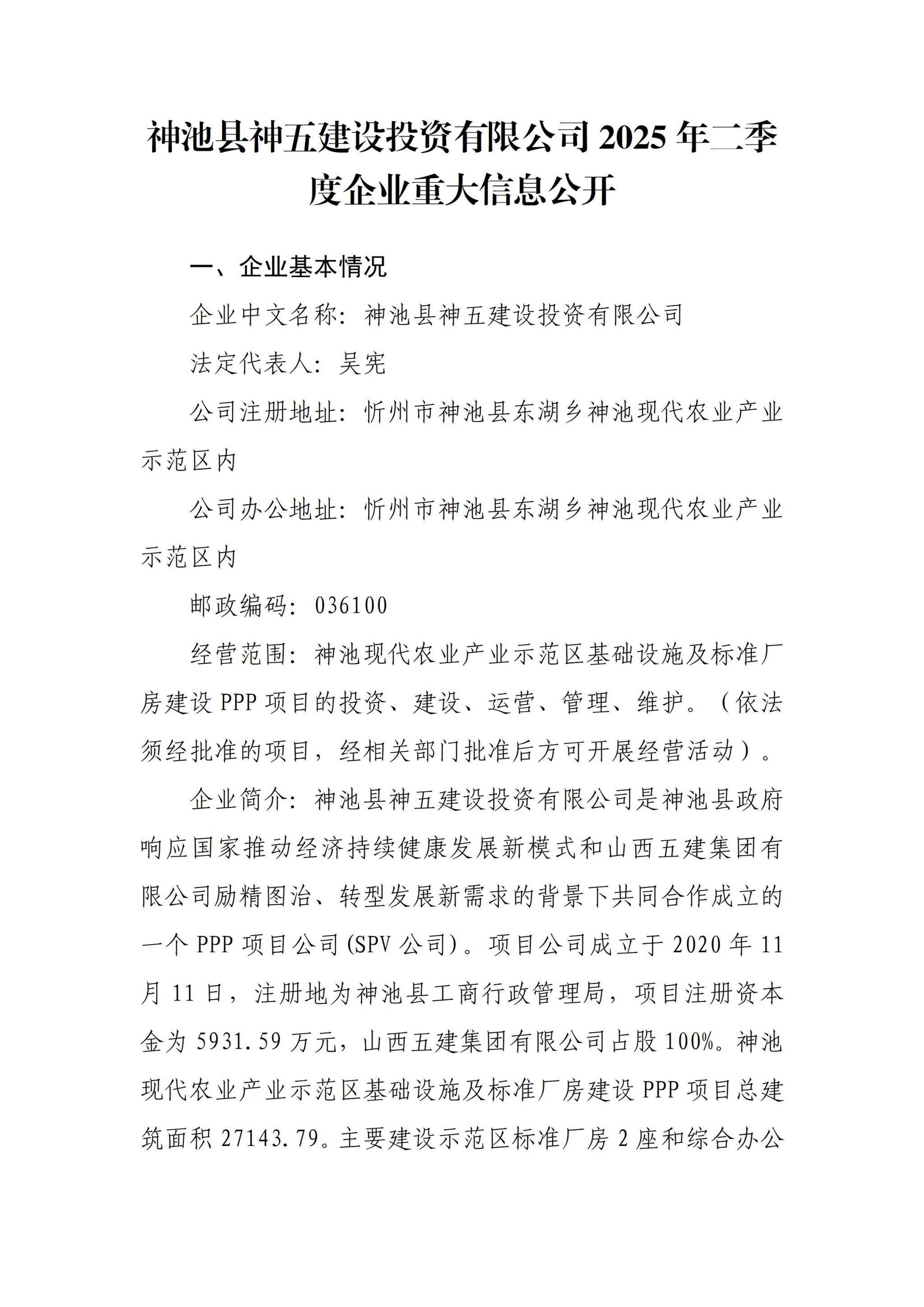 神池县神五建设投资有限公司2025年第二季度企业重大信息公开