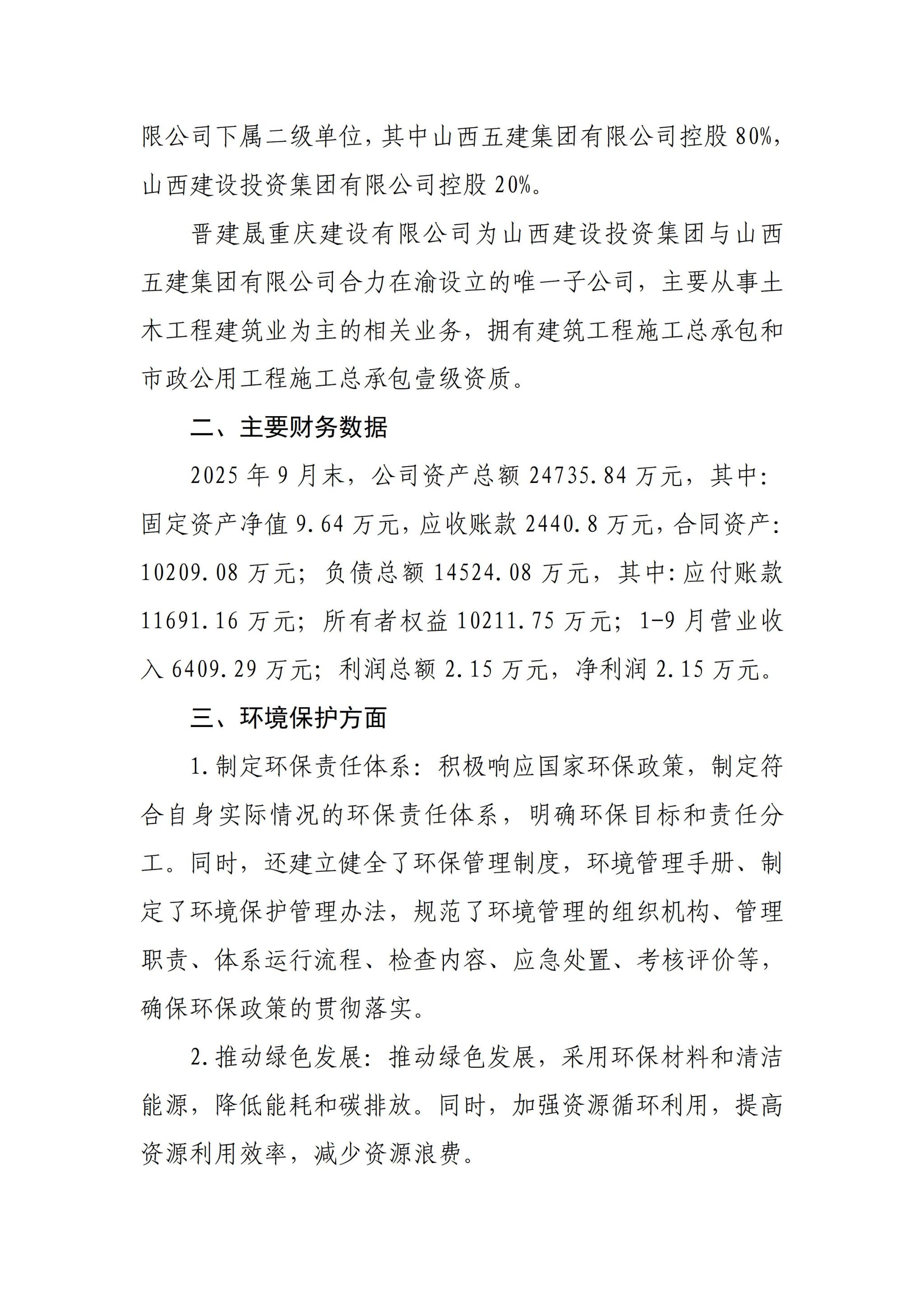 晋建晟重庆建设有限公司2025年三季度企业重大信息公开