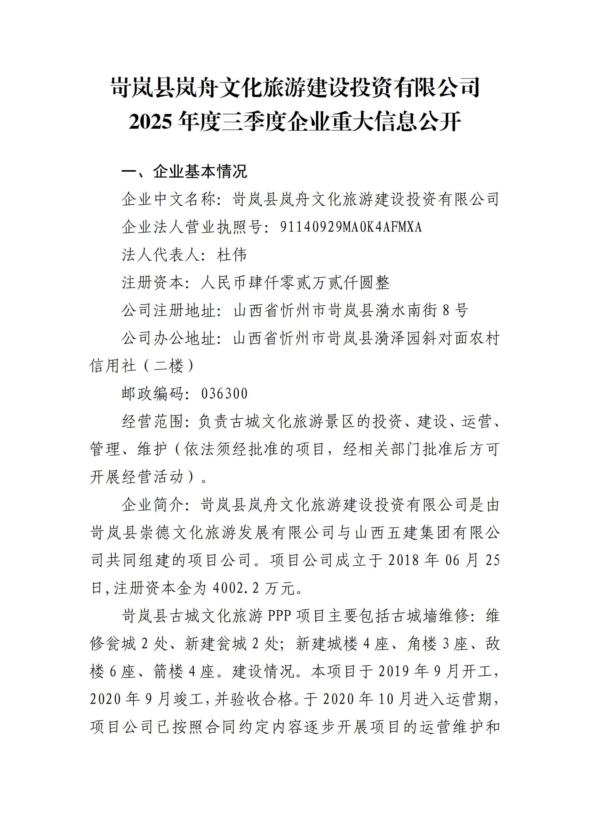 岢岚县岚舟文化旅游建设投资有限公司2025年第三季度企业重大信息公开