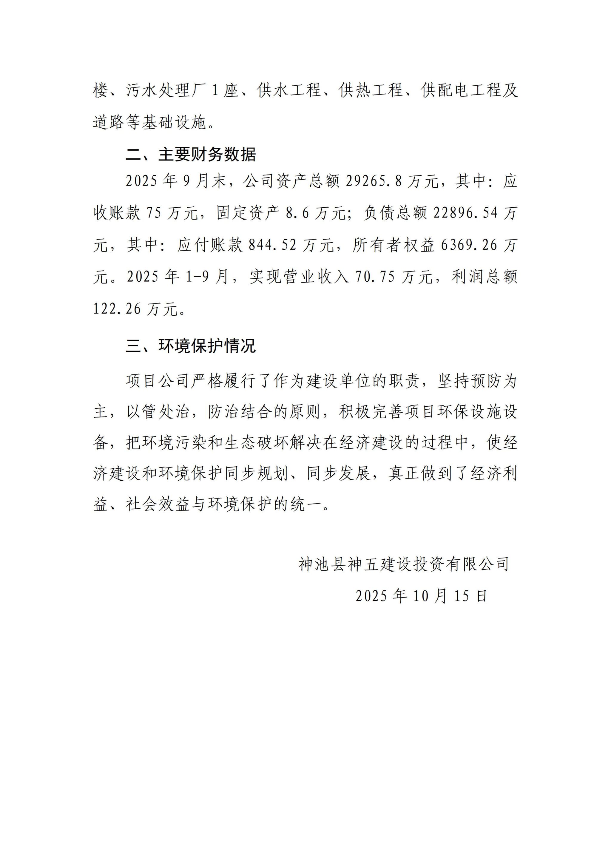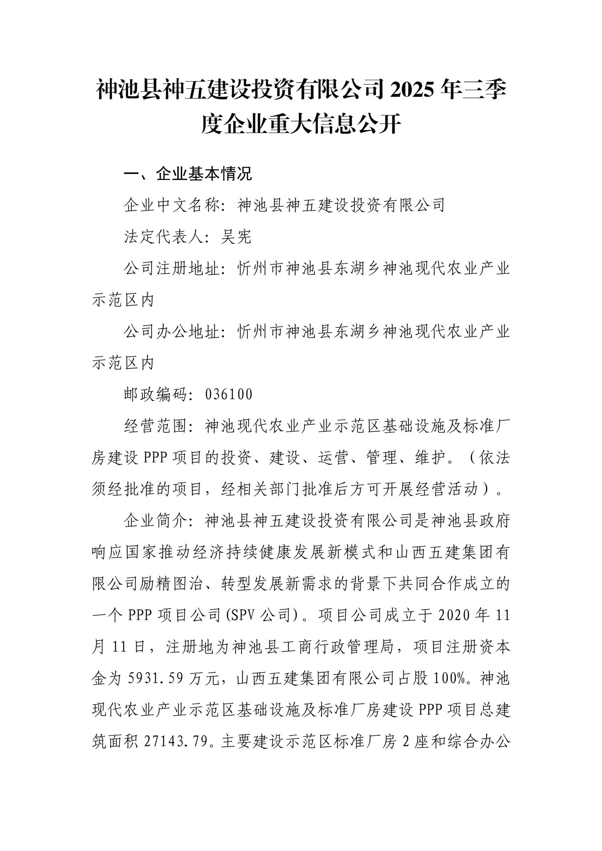 神池县神五建设投资有限公司2025年第三季度企业重大信息公开