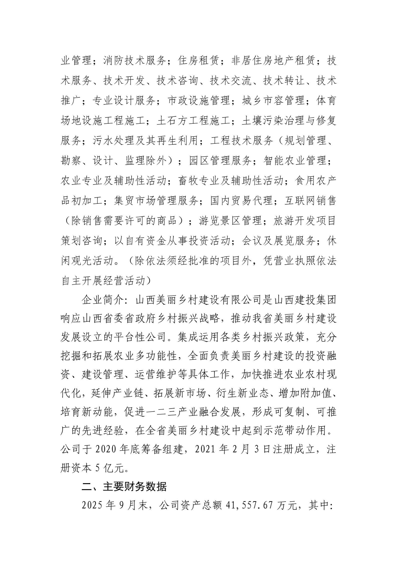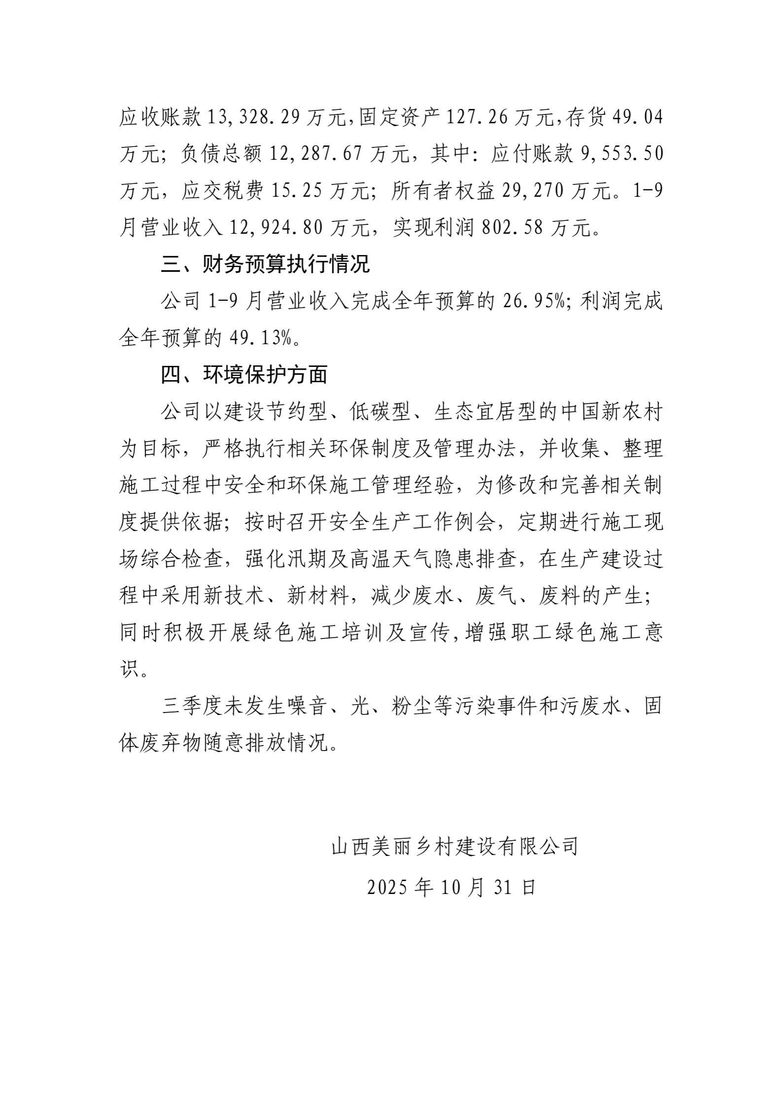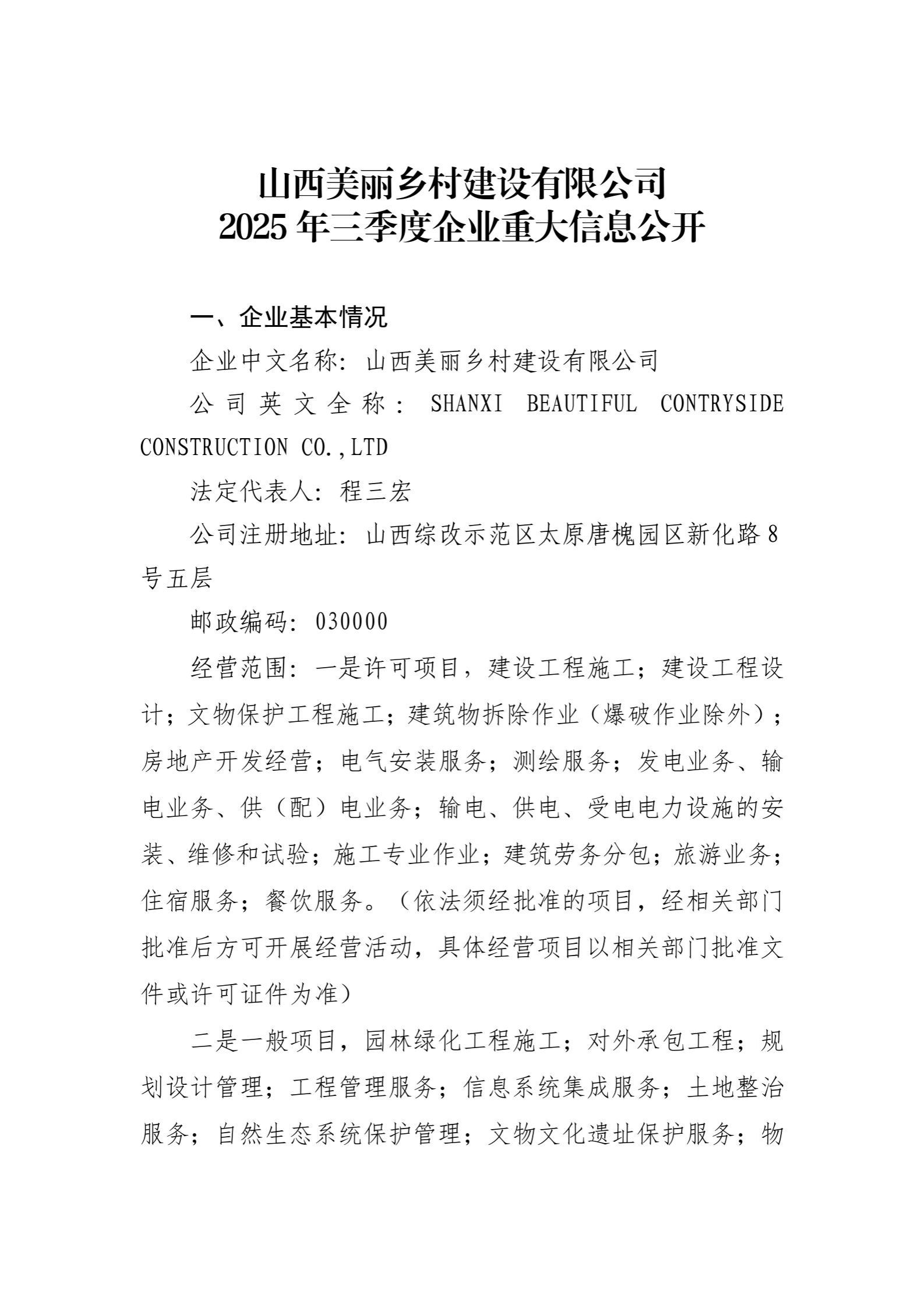 山西美丽乡村建设有限公司2025年三季度企业重大信息公开